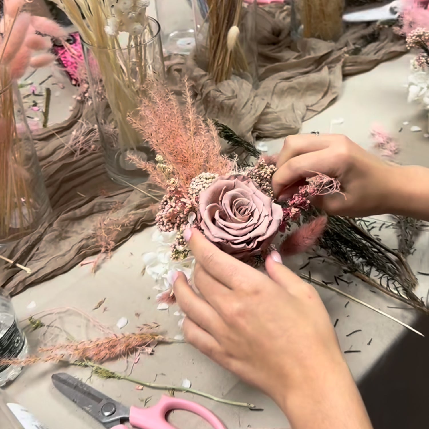 We add a touch of luxury to every arrangement by incorporating preserved hydrangea around the vase neck, elevating the overall design and giving each piece an expensive, fully-designed finished look. It’s all about the little details that make a big impact!