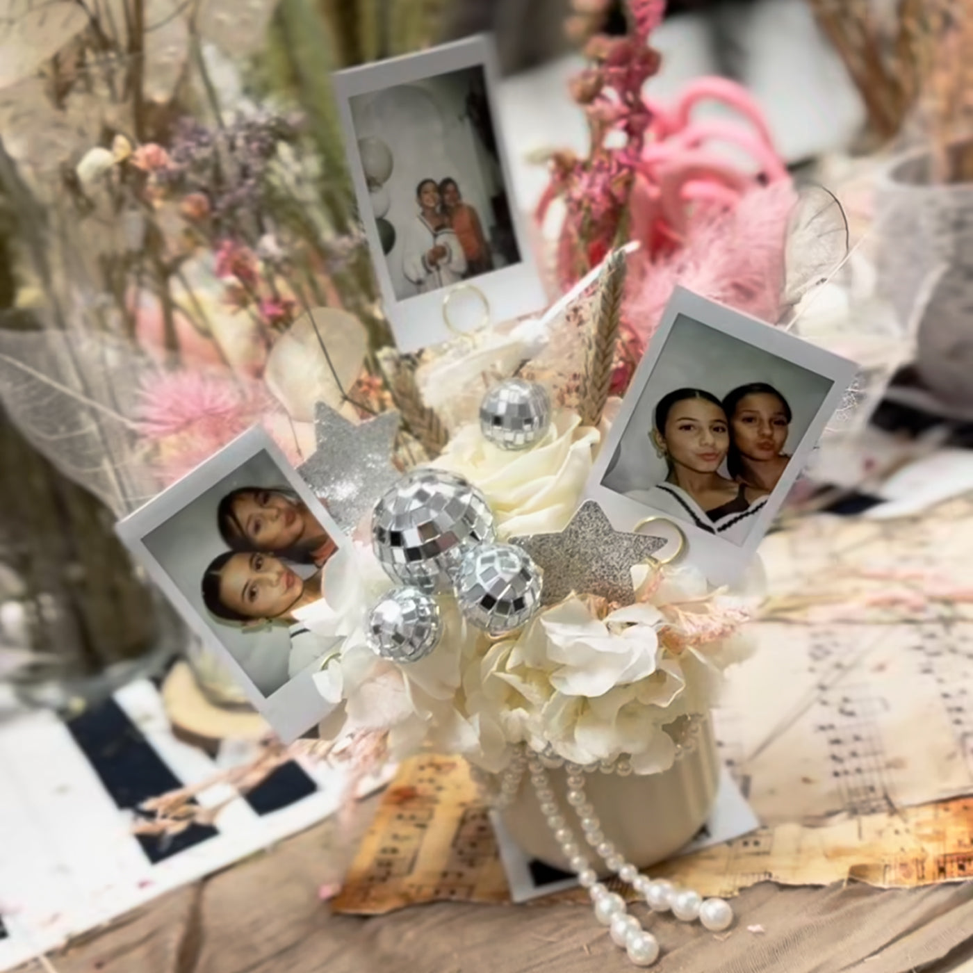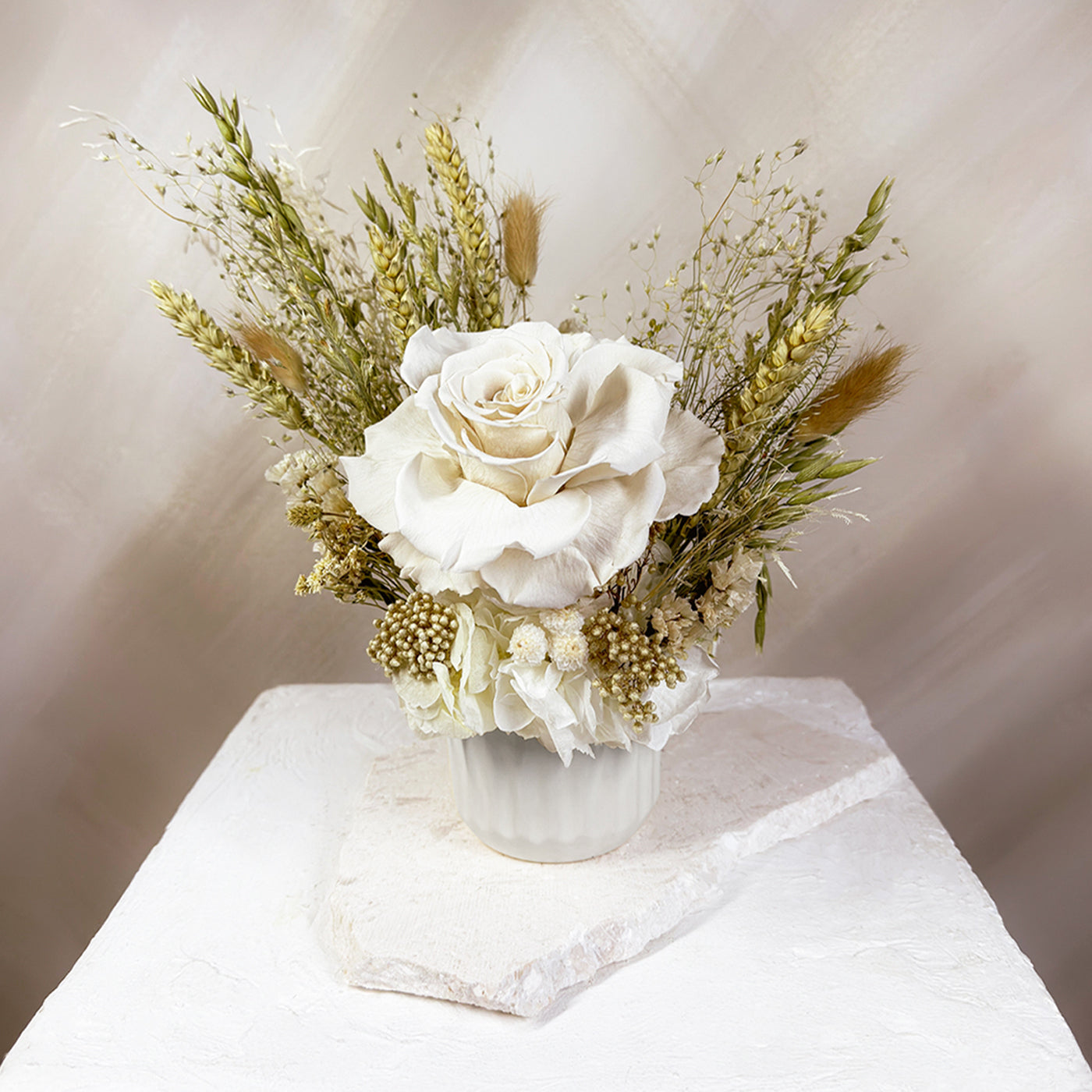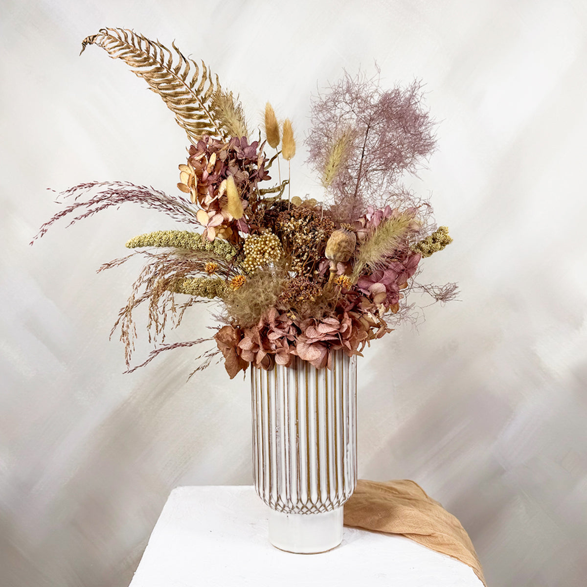 Create something of your own with our most intimate workshop experience! Our designers will help you curate a show-stopping arrangement thats perfect for your coffee table, entryway and more! Featuring preserved roses with dried foliage flowers, fillers, a unique one of one ceramic vase, and all the tools you'll need craft your floral materpiece!